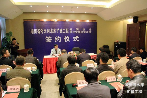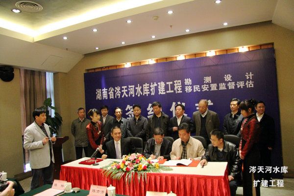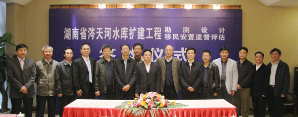 11月8日,湖南省潇水涔天河水库扩建工程《勘察设计合同》暨《移民安置综合监理及监测评估合同》签字仪式在长沙举行。湖南涔天河工程建设投资有限责任公司分别与涔天河水库扩建工程勘察设计服务中标单位湖南省水利水电勘测设计研究总院,移民安置综合监理及监测评估服务中标单位湖南省湘怡移民工程监理咨询有限公司、江河水利水电咨询中心(联合体)签订了服务合同。湖南省政府副秘书长陈吉芳、水利部水利水电规划设计总院副院长陈伟及省水利厅、省移民局有关领导,市政府副市长舒平、市政协副主席廖秋文、市委副秘书长李祥红出席签约仪式。
