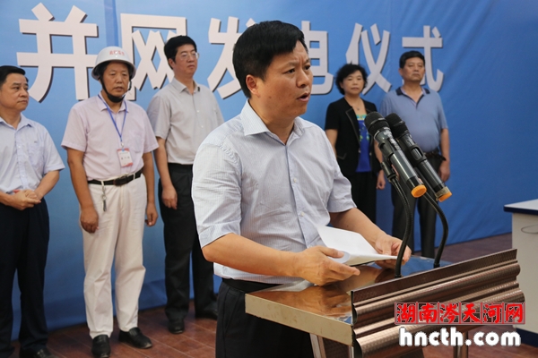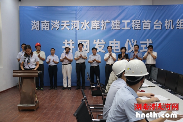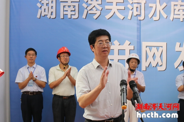 永州市委常委、江华瑶族自治县县委书记罗建华宣布涔天河水库扩建工程首台机组并网发电